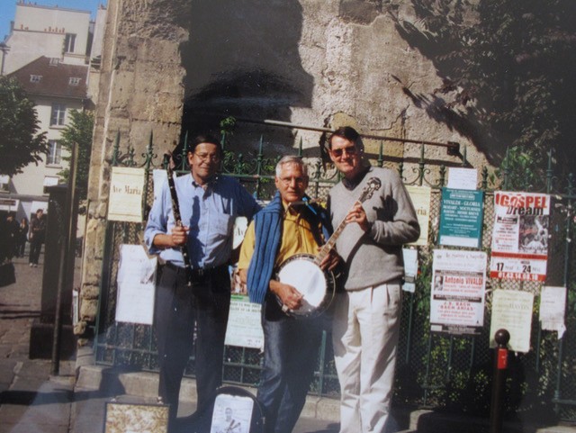 On a street corner in Paris, France, two banjo players overcome a language barrier and exchange musical ideas on the instrument.