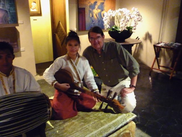 In South East Asia, he listened to a dinner hour trio which included a musician who played a traditional banjo variant with a wooden head.