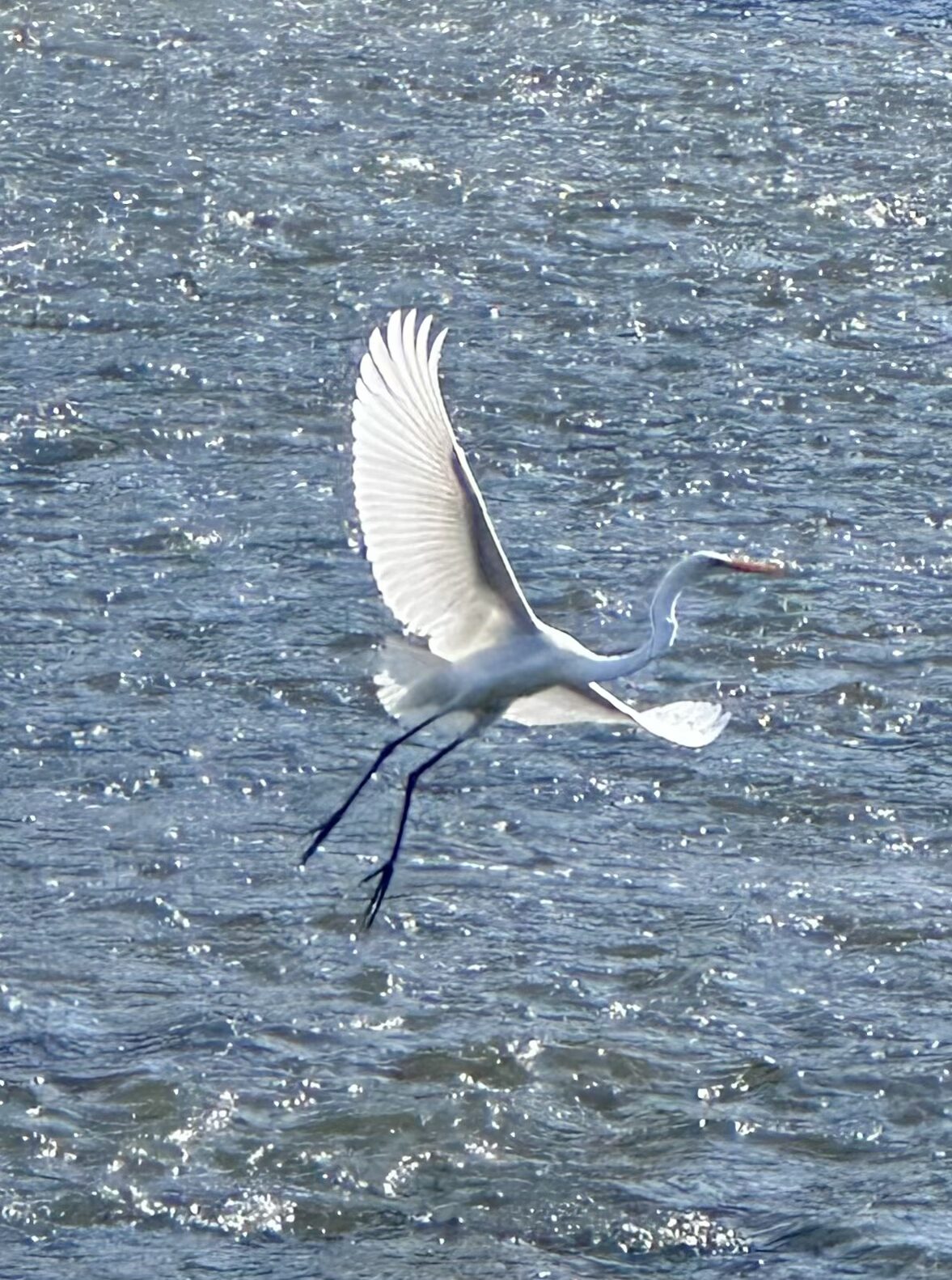 Despite the sun-dappled waters of the meandering River, this magnificent snowy white avian will soon venture South to more temperate environs.