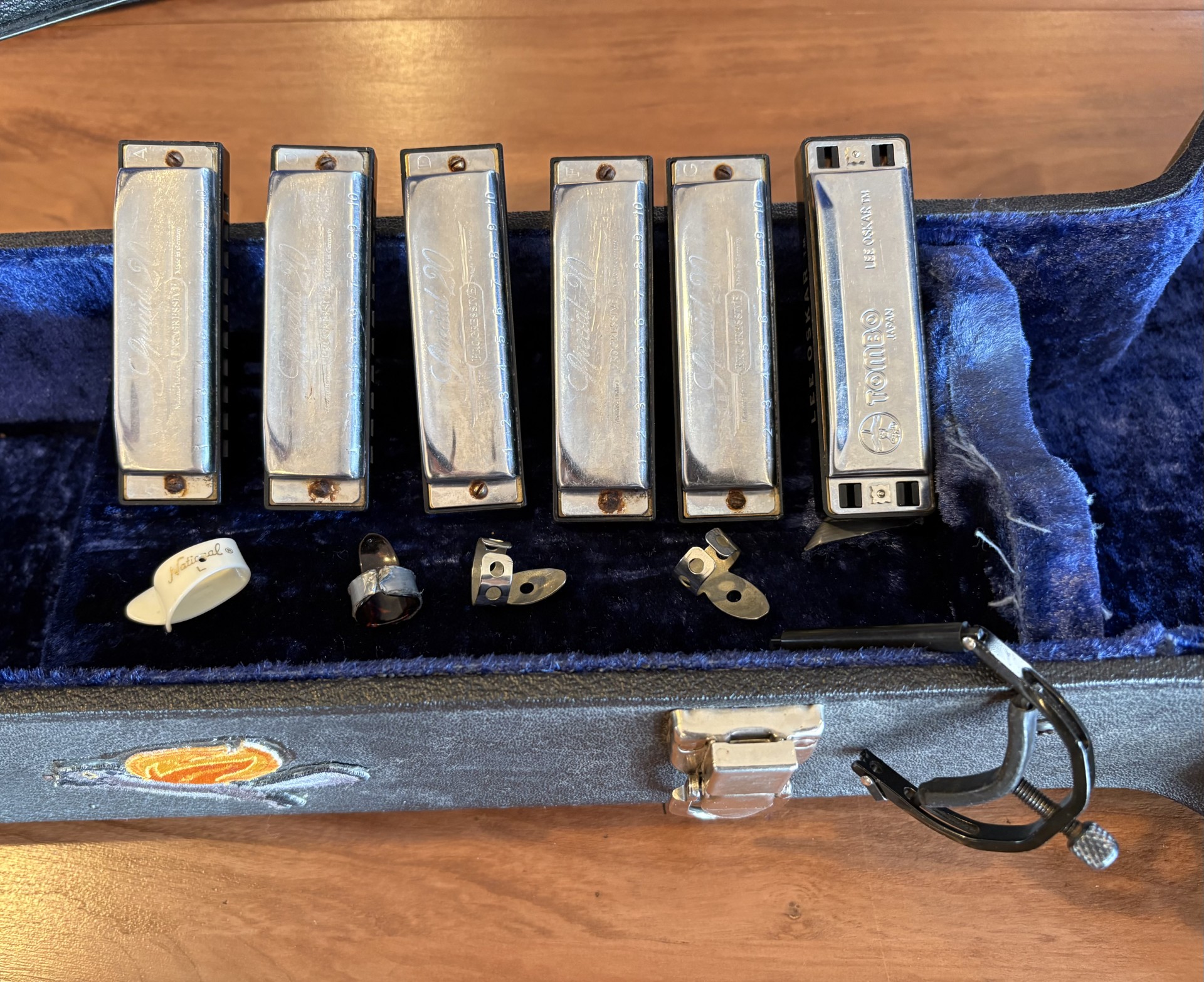 When playing at jams, the BRC musician lines-up his harmonicas alphabetically in his banjo case for easy access as seen above. He also frequently soaks his harmonicas in tap water prior to performing which almost doubles the volume and clarity of the instrument. To hear a blues harmonica solo by the BRC musician, enter boogie in the search engine and tap enter. Scroll down the page to find the sound file to “McBaine Boogie” which is performed in the key of G. Play the sound file and experiment accompanying it with a C harmonica.