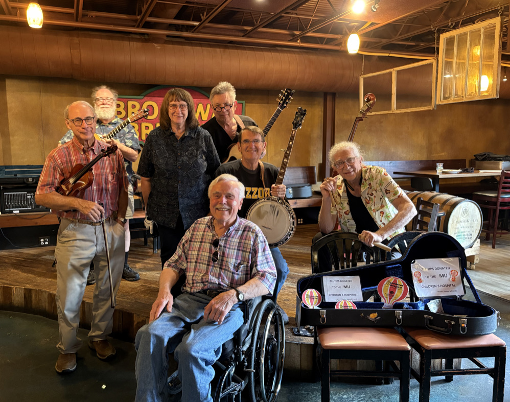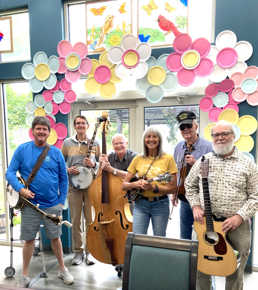 Last month, the mid week jam in a village near the Lake of the Ozarks convened again in a community retirement facility. As usual, our afternoon gig was held in the dining hall to accommodate the crowd of listeners who received us graciously. Following our performance of hoedown tunes, sing-alongs, and instrumentals, an elderly resident walked-up to us to say hello. With appreciation, she commented that at age 91 years old, she enjoyed our gospel tunes the most. The band thanked her for the lovely feedback, and we then regrouped for a gig photo at the festively decorated doorway to the sunny back patio.