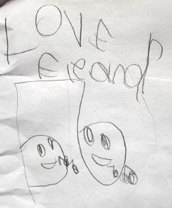 Lastly, and most importantly, we were presented with the young artist`s perception of our happy faces, while we were pickin` & grinnin` & singin`. She anonymously autographed this final work with “Love, Friend (sic)” In all, we were gifted with about a dozen of her sketches, and the Mom took a photograph of her talented daughter on stage with us grateful musicians. It was a joyful afternoon for all.