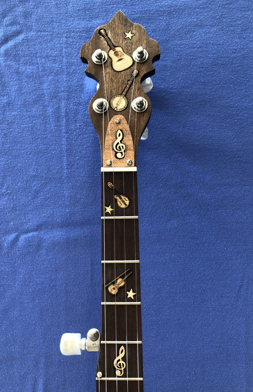 The 64th annual Art in the Park outdoor festival reconvened last weekend in our municipal lakeside green space after a two year covid hiatus. For its yearly Veteran`s Tent pavilion, the BRC founder, who is a former USAF medical corps serviceman, submitted to the show an “Auric Eagle” banjo which was festooned with laser-cut wood inlays.